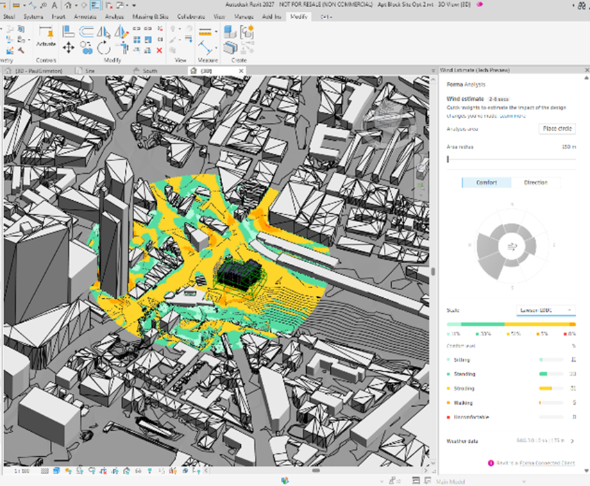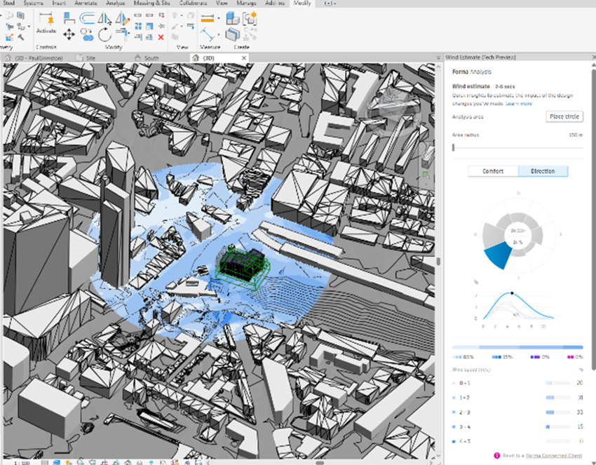 Denna analys beräknas på några sekunder och ger resultat för både gångkomfort samt vindhastighet och vindriktning. Simuleringsområdet definieras genom att placera en cirkulär zon i modellen. Resultatet färgkodas i Revit‑vyn och kompletteras med detaljer i Forma Analysis‑panelen.