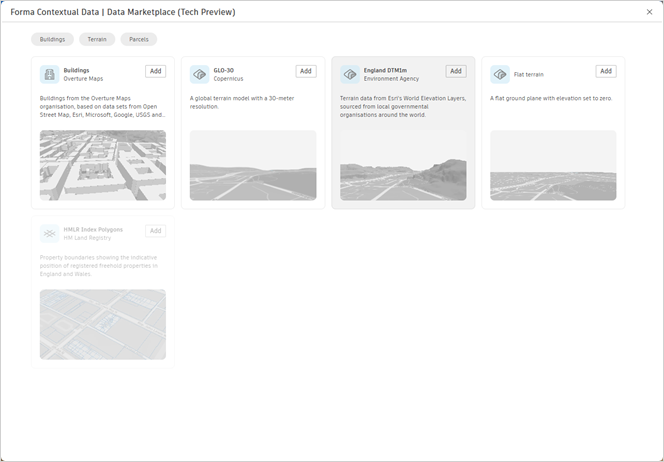 Som en del av anslutningsprocessen måste även projektets geolokalisering anges, vilket krävs för att kontext‑ och vinddata ska bli relevanta för projektets faktiska plats. När modellen är kopplad till ett scenario kan kontextuell data beställas via Forma Marketplace panelen. Vilken data som är tillgänglig beror på projektets geografiska placering.