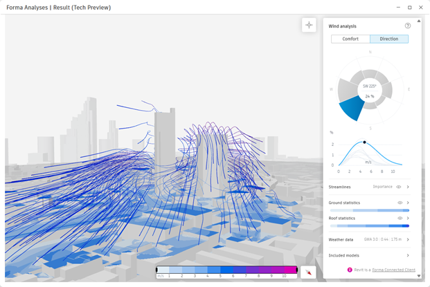 Den mer avancerade simuleringen analyserar vindriktning och komfort mer detaljerat och kan ta mellan 30 och 60 minuter beroende på modellens komplexitet. Analysen körs i Formas molnplattform och påverkar därför inte prestandan i Revit. När analysen är klar visas resultaten i ett separat fönster, inklusive strömlinjer för interaktiv visualisering av luftflöden runt byggnaden.